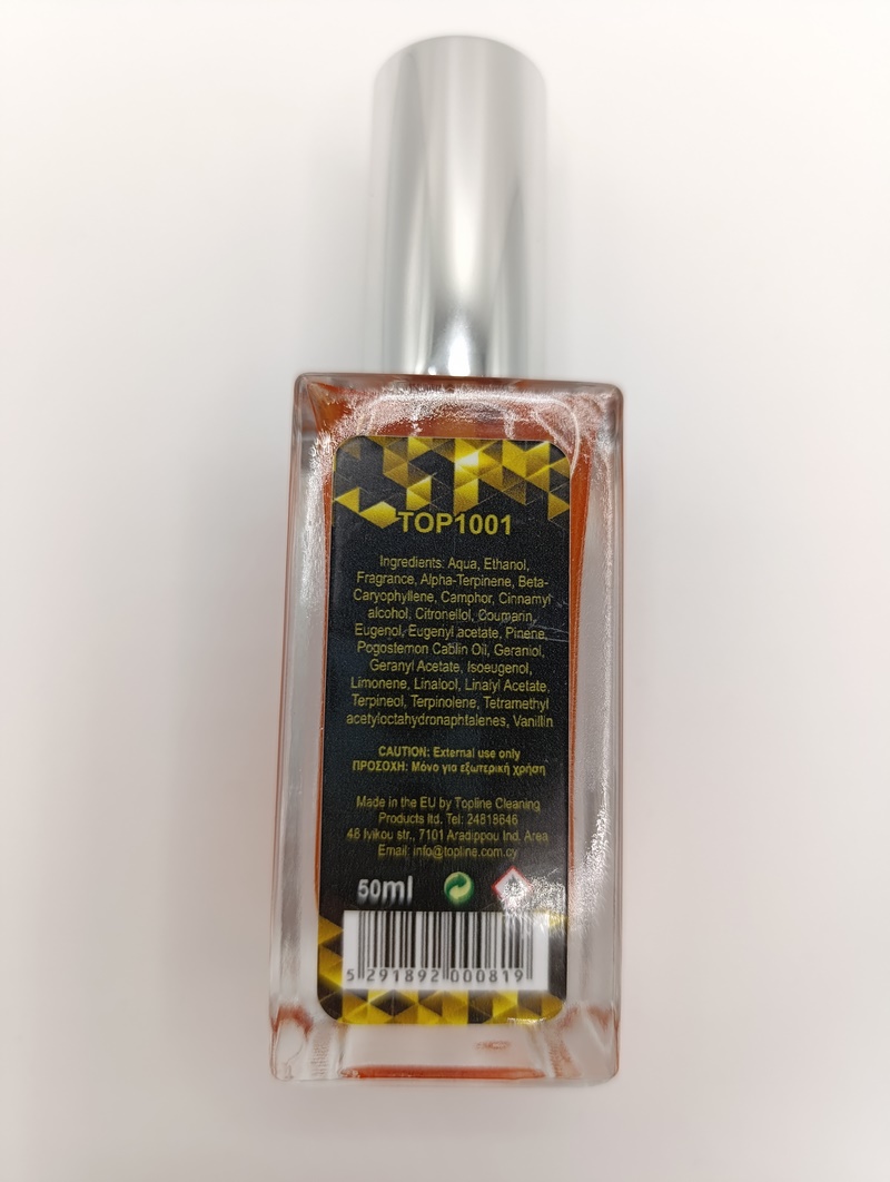 Ingredients: Aqua, Ethanol, Fragrance, Alpha-Terpinene, Beta-Caryophyllene, Camphor, Cinnamyl alcohol, Citronellol, Coumarin, Eugenol, Eugenyl acetate, Pinene, Pogostemon Cablin Oil, Geraniol, Geranyl Acetate, Isoeugenol, Limonene, Linalool, Linalyl Acetate, Terpineol, Terpinolene, Tetramethyl acetyloctahydronaphtalenes, Vanillin.